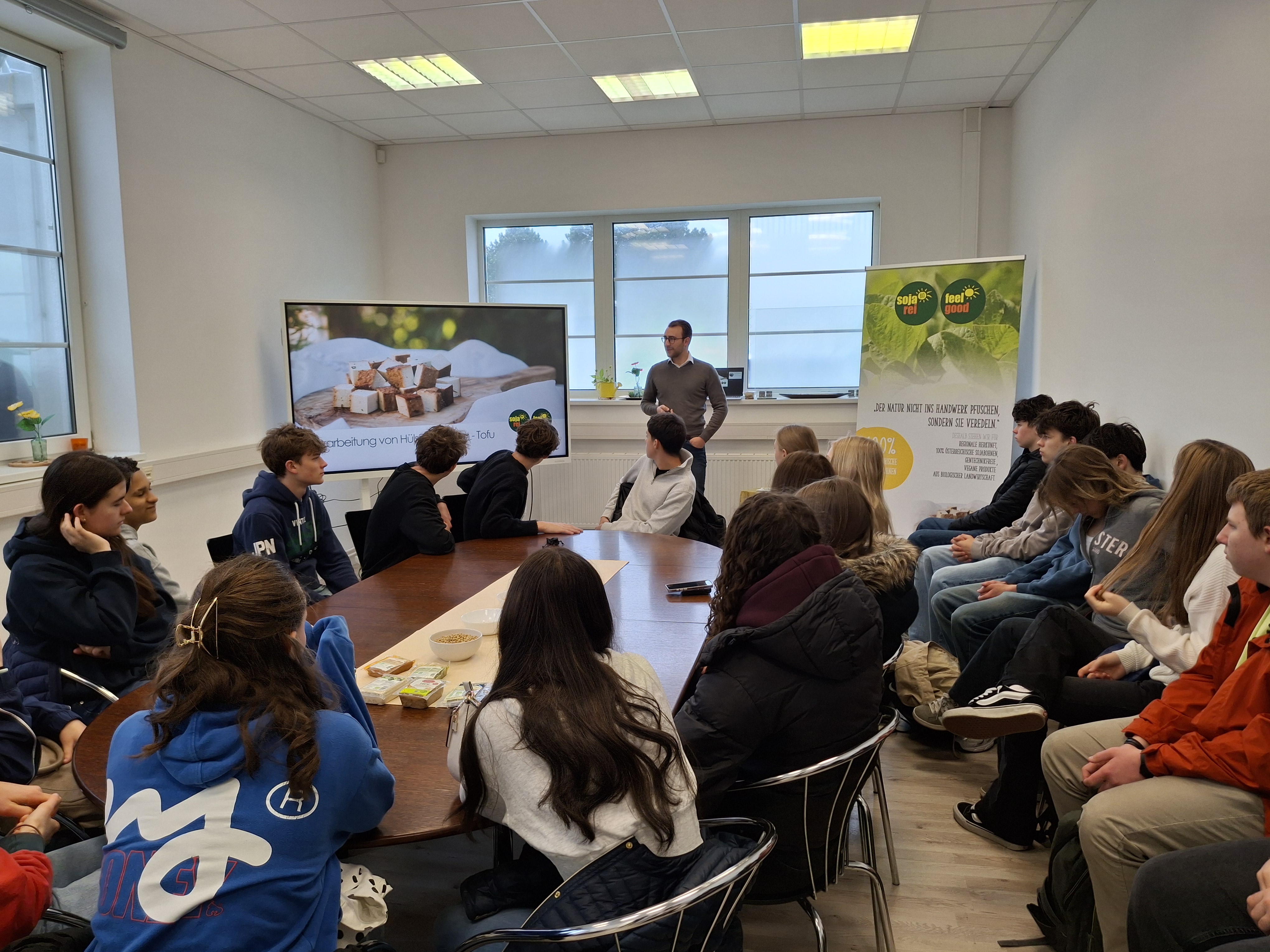 Geschäftsführer Christoph Eschner, BSc, gewährte den Schülerinnen und Schülern spannende Einblicke hinter die Kulissen der Produktion. Anschaulich erklärte er, wie aus regionalen Bio‑Sojabohnen hochwertige, nachhaltige Lebensmittel entstehen und welche betrieblichen Abläufe dafür notwendig sind. Auch zentrale Marketingstrategien des Unternehmens wurden vorgestellt und mit dem im Unterricht erlernten Wissen verknüpft.