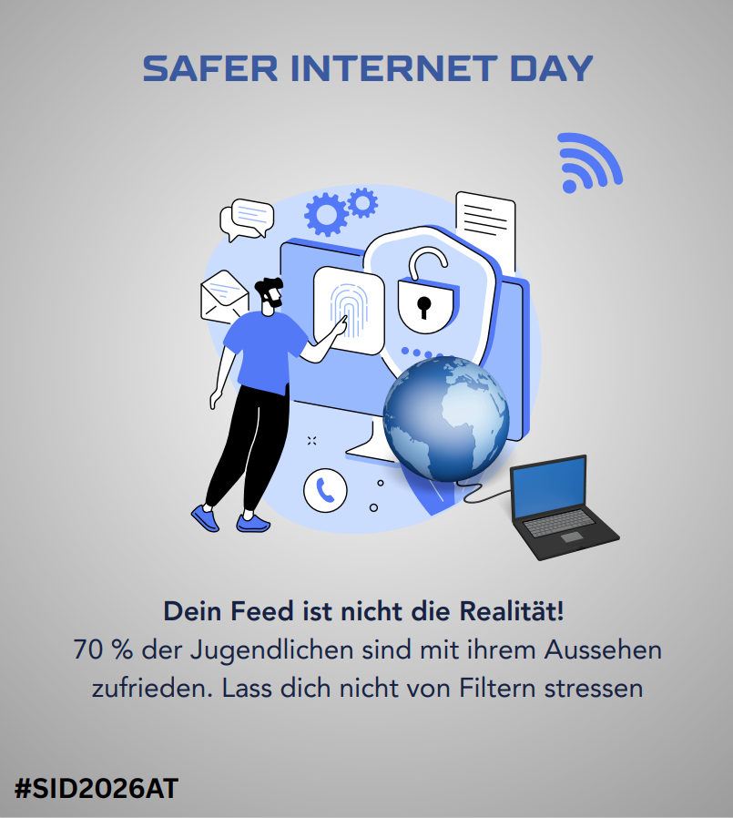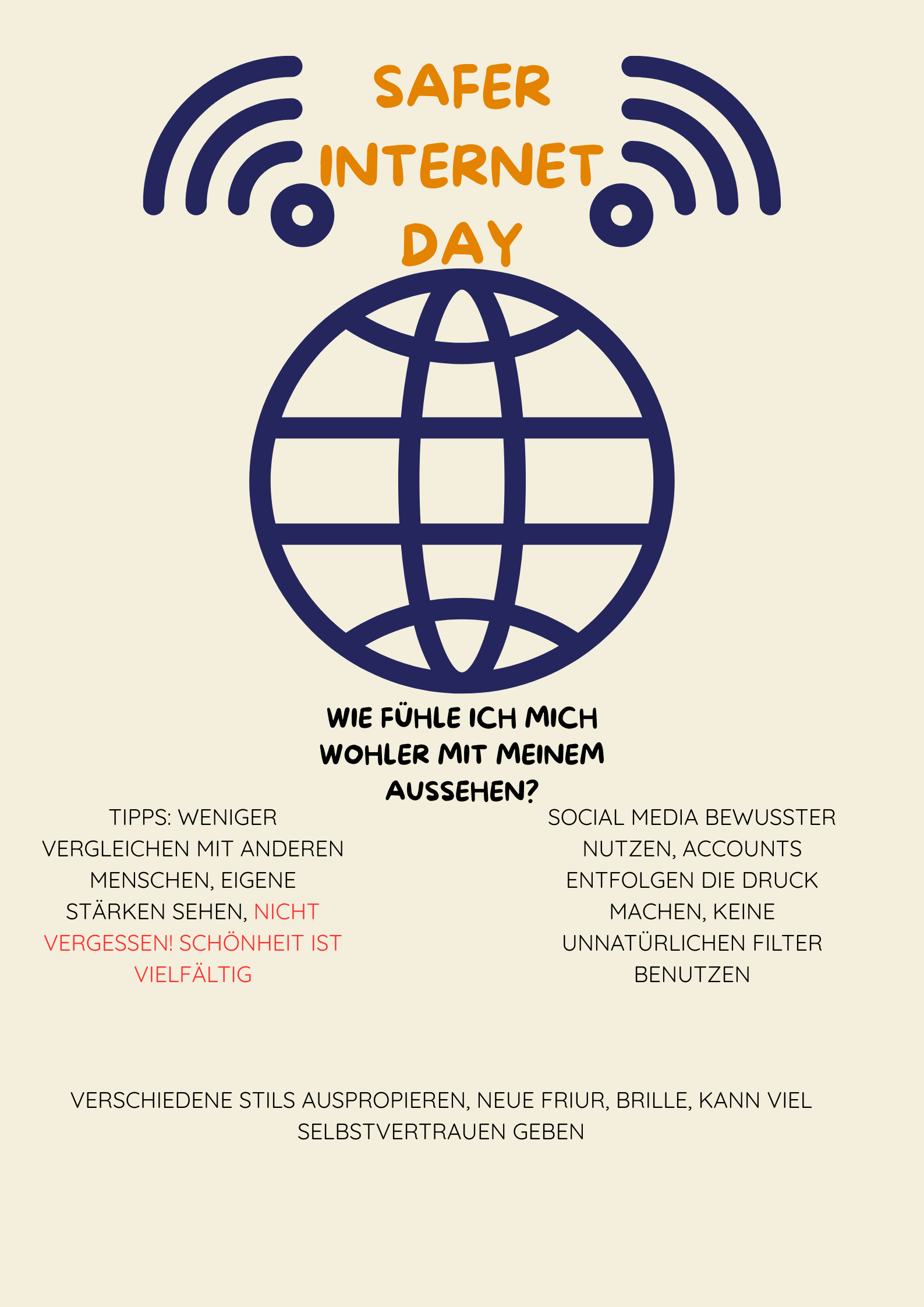 Die Klasse beschäftigte sich heuer mit dem Thema Schönheitsideale im Internet. Dabei wurde sichtbar, wie stark Filter, Bearbeitung und inszenierte Inhalte unsere Wahrnehmung beeinflussen. Die Schülerinnen und Schüler setzten sich kritisch damit auseinander und entwickelten Tipps für einen bewussteren Umgang mit Social Media. #SID2026AT