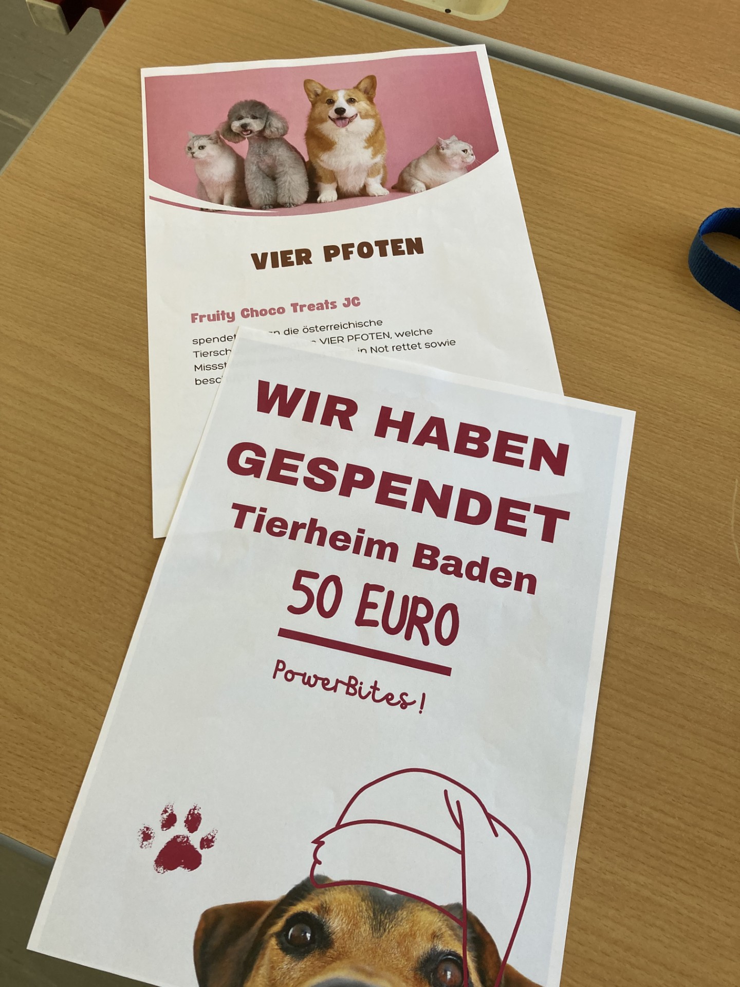 Die beiden Junior Companies der 3TDM im Schuljahr 2025/26, Fruity Choco Treats und Power Bites, haben einen Teil ihres Umsatzes an zwei Tierschutzorganisationen gespendet. 50,00 EUR gingen an das Tierheim Baden und 33,00 EUR an die Tierschutzorganisation Vier Pfoten.